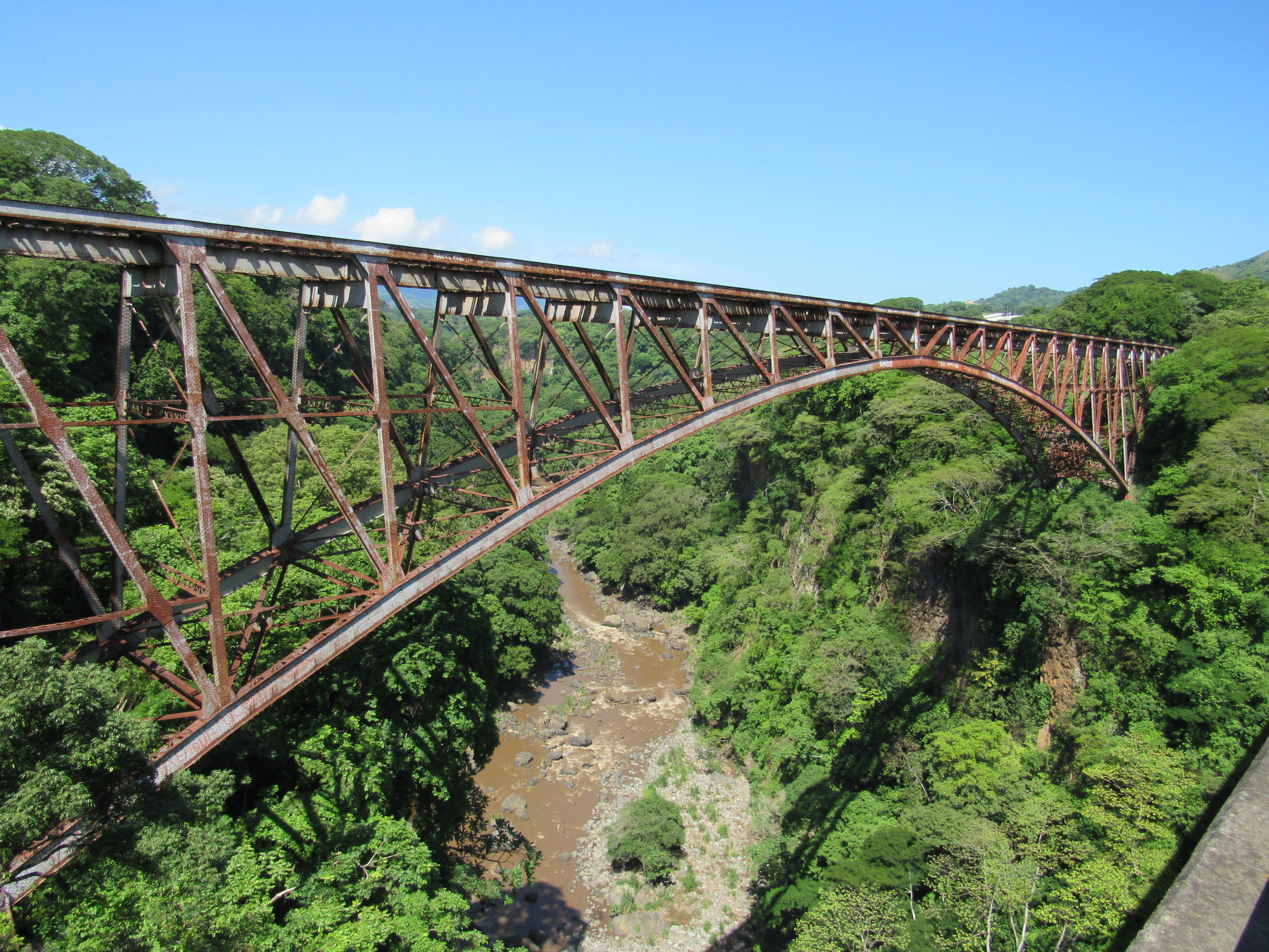 Las bases del puente, localizadas a ambos lados del río, fueron construidas en piedra, proveniente del cañón del río. Una vez finalizadas, se empezaron a remachar las piezas metálicas. Este trabajo se hizo en forma simultánea, de manera que se avanzara por ambos lados, buscando como meta unirlas al centro. Al final se llegaron a unir con tal exactitud que no generó ningún desfase.